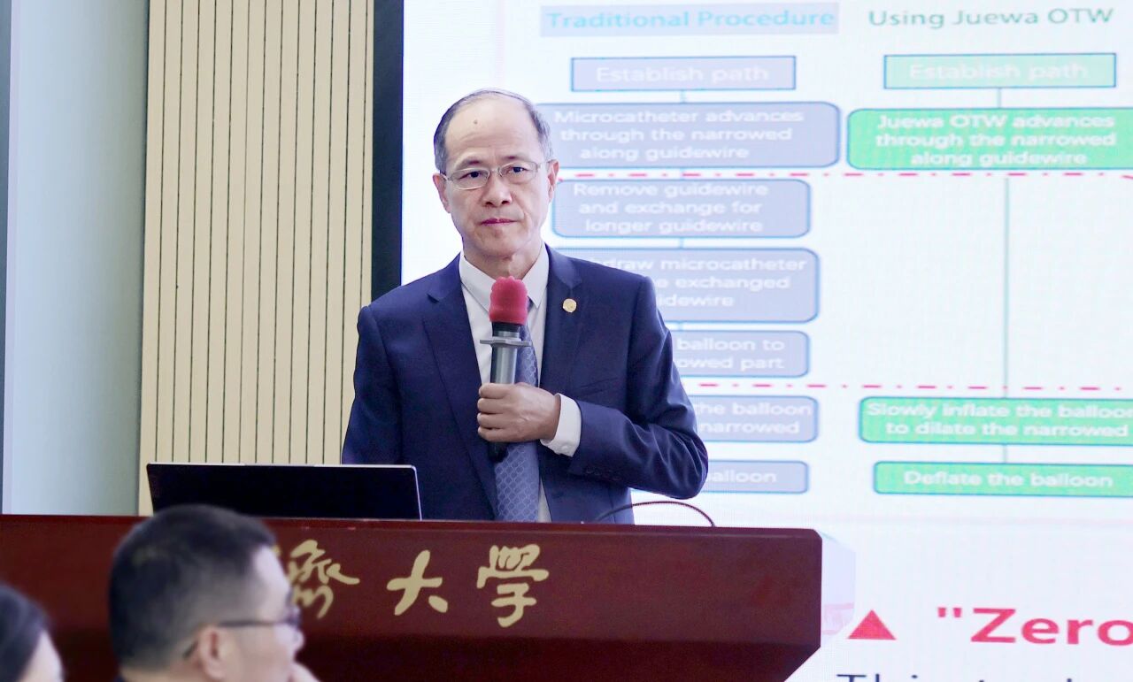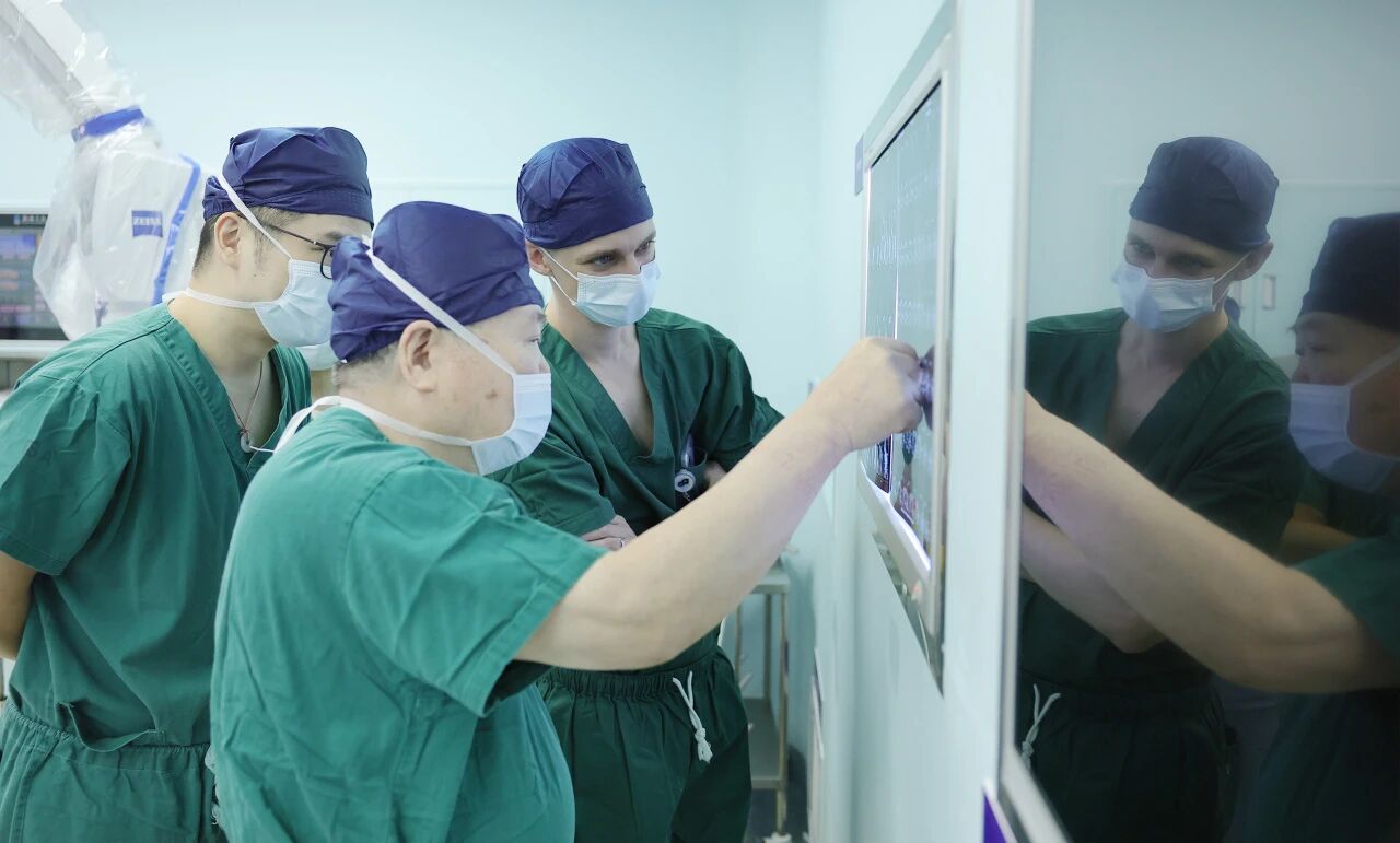 手術過程中,席剛明教授、王貴平博士團隊通過一個微創通道,高效完成了微導管超選、球囊擴張與支架釋放等一系列復雜操作,將傳統術式中所需的多次導管交換步驟簡化為一體化的流暢流程,顯著縮短了手術時間,降低了術中栓塞等風險。
