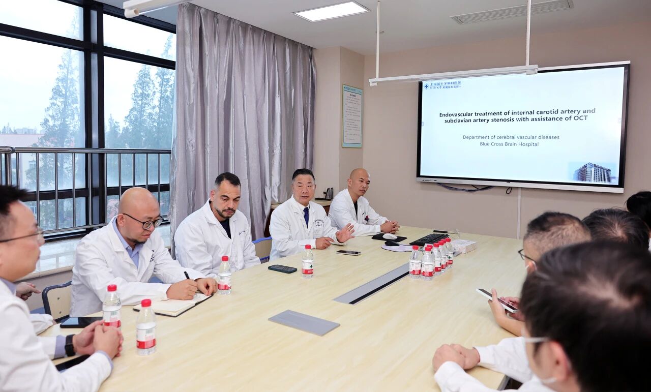 Tareq Kass-Hout副教授在潘耀良副院長陪同下,深入4F腦血管病科,圍繞一例復雜的“頸內動脈合并鎖骨下動脈狹窄”病例,與科室團隊進行了深入討論。雙方重點探討了OCT(光學相干斷層成像)這一前沿血管內影像技術在術前評估、術中支架選型與放置、以及術后效果評價中的關鍵作用。Tareq Kass-Hout副教授對上海藍十字腦科醫院能夠熟練運用OCT技術處理復雜病變表示贊賞,并結合該病例與與席剛明教授、王貴平博士團隊就抗血小板治療策略調整、栓塞保護方案優化、不同介入路徑(如橈動脈)的器械選擇等臨床難點展開交流。這場基于真實病例的深度對話,超越技術展示層面,直擊臨床決策核心,充分體現雙方合作的務實與高效,也為未來在腦血管介入領域的聯合研究與技術提升開辟了新路徑。