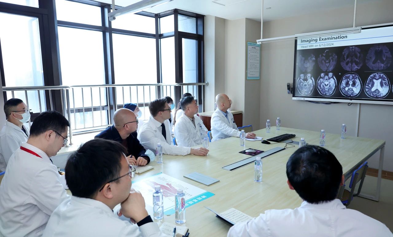 此外,圍繞患者圍手術(shù)期管理、DeepSeek及AI醫(yī)療技術(shù)在神經(jīng)外科領(lǐng)域的應(yīng)用前景等熱點(diǎn)話題,雙方還開展了深入探討。與此同時(shí), Sean P.Polster博士在副院長(zhǎng)潘耀良等陪同下,來到4A腦血管病一科,與學(xué)術(shù)副院長(zhǎng)兼4F主任席剛明教授,4A腦血管病一科副主任王貴平博士以及科室醫(yī)療骨干共同參加查房和討論。