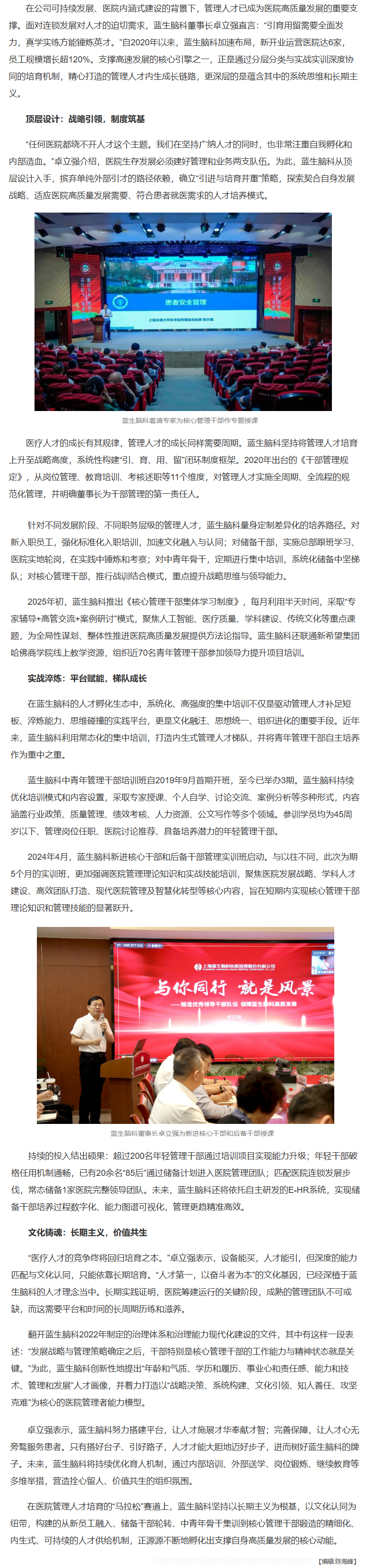 在公司可持續(xù)發(fā)展、醫(yī)院內(nèi)涵式建設(shè)的背景下,管理人才已成為醫(yī)院高質(zhì)量發(fā)展的重要支撐。面對連鎖發(fā)展對人才的迫切需求,藍生腦科董事長卓立強直言:“引育用留需要全面發(fā)力,真學(xué)實練方能錘煉英才。”自2020年以來,藍生腦科加速布局,新開業(yè)運營醫(yī)院達6家,員工規(guī)模增長超120%。支撐高速發(fā)展的核心引擎之一,正是通過分層分類與實戰(zhàn)實訓(xùn)深度協(xié)同的培育機制,精心打造的管理人才內(nèi)生成長鏈路,更深層的是蘊含其中的系統(tǒng)思維和長期主義。