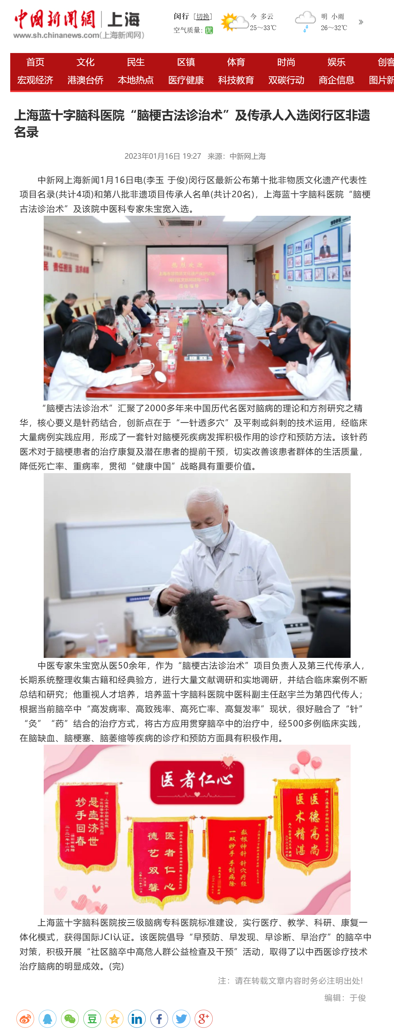 中新網(wǎng)上海新聞1月16日電(李玉 于俊)閔行區(qū)最新公布第十批非物質文化遺產代表性項目名錄(共計4項)和第八批非遺項目傳承人名單(共計20名),上海藍十字腦科醫(yī)院“腦梗古法診治術”及該院中醫(yī)科專家朱寶寬入選。