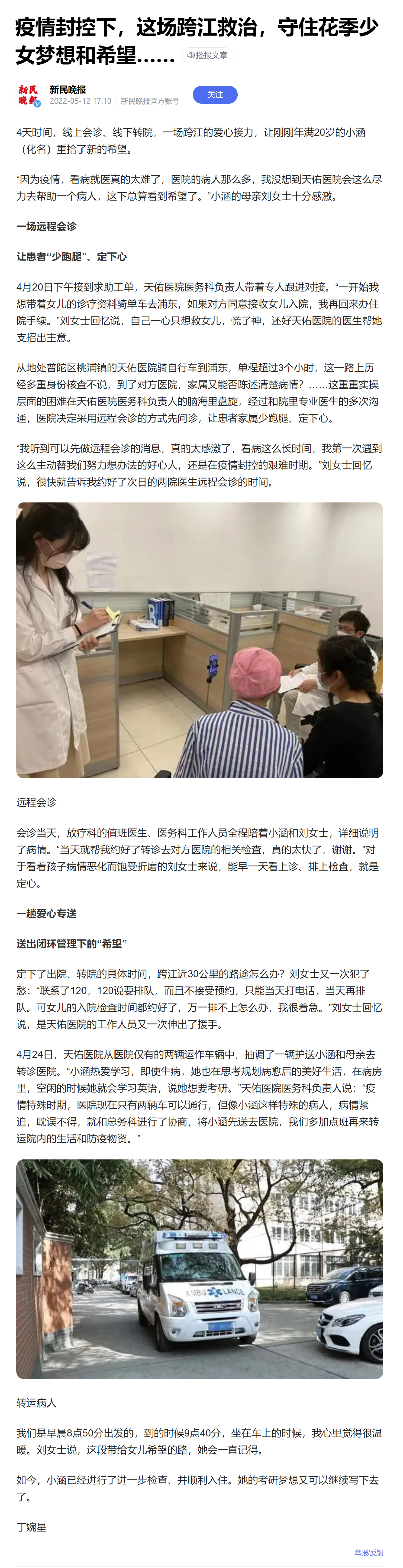 “因為疫情,看病就醫真的太難了,醫院的病人那么多,我沒想到天佑醫院會這么盡力去幫助一個病人,這下總算看到希望了。”小涵的母親劉女士十分感激。