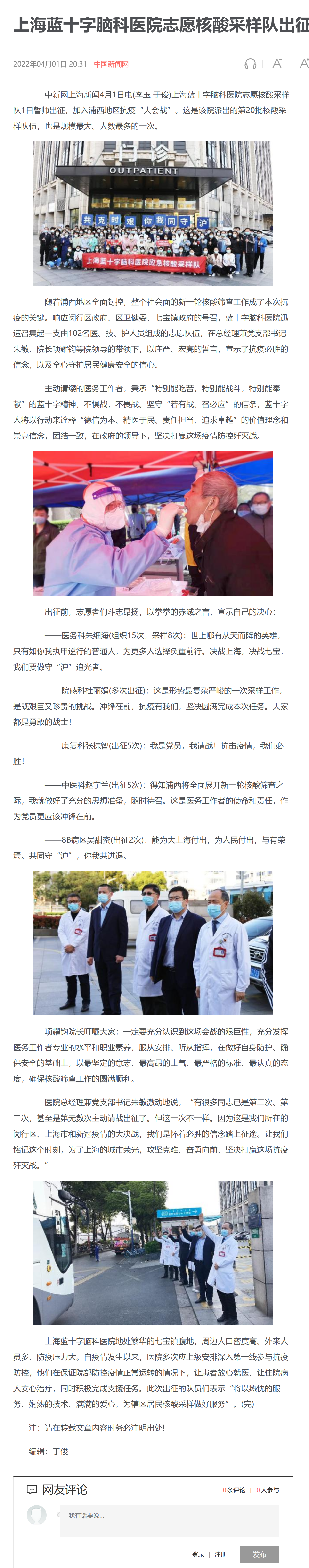 中新網(wǎng)上海新聞4月1日電(李玉 于俊)上海藍十字腦科醫(yī)院志愿核酸采樣隊1日誓師出征,加入浦西地區(qū)抗疫“大會戰(zhàn)”。這是該院派出的第20批核酸采樣隊伍,也是規(guī)模最大、人數(shù)最多的一次。