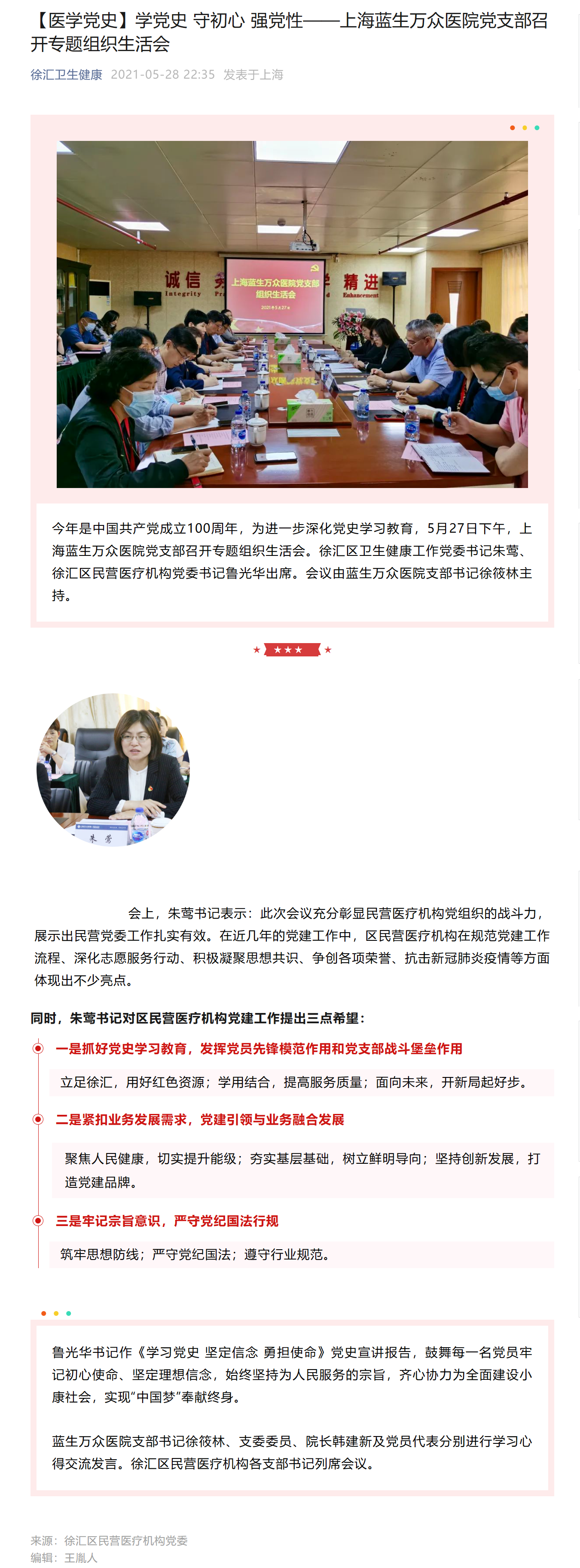 今年是中國共產黨成立100周年,為進一步深化黨史學習教育,5月27日下午,上海藍生萬眾醫院黨支部召開專題組織生活會。徐匯區衛生健康工作黨委書記朱鶯、徐匯區民營醫療機構黨委書記魯光華出席。會議由藍生萬眾醫院支部書記徐筱林主持。