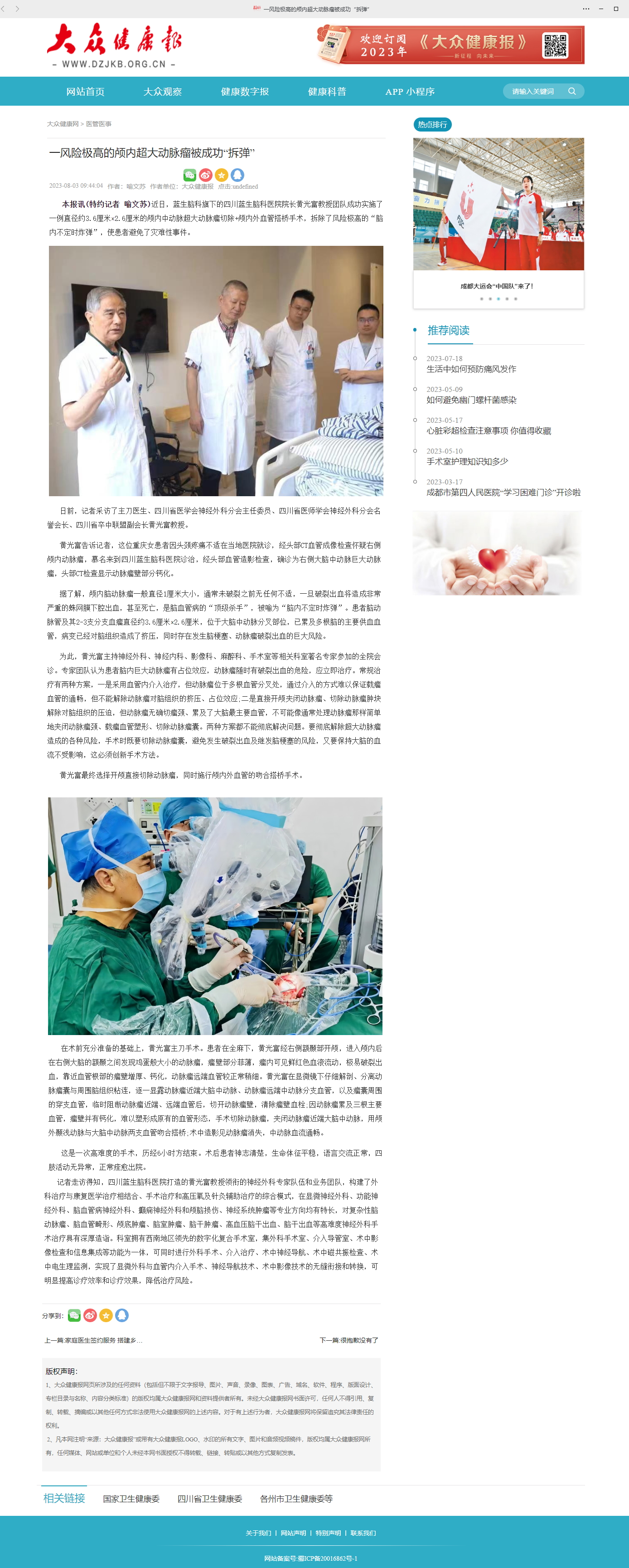 本報訊(特約記者 喻文蘇)近日,藍生腦科旗下的四川藍生腦科醫院院長黃光富教授團隊成功實施一例直徑約3.6厘米x2.6厘米的頗內中動脈超大動脈瘤切除+顱內外血管搭橋手術,拆除了風險極高的“”,使患者避免了災難性事件
