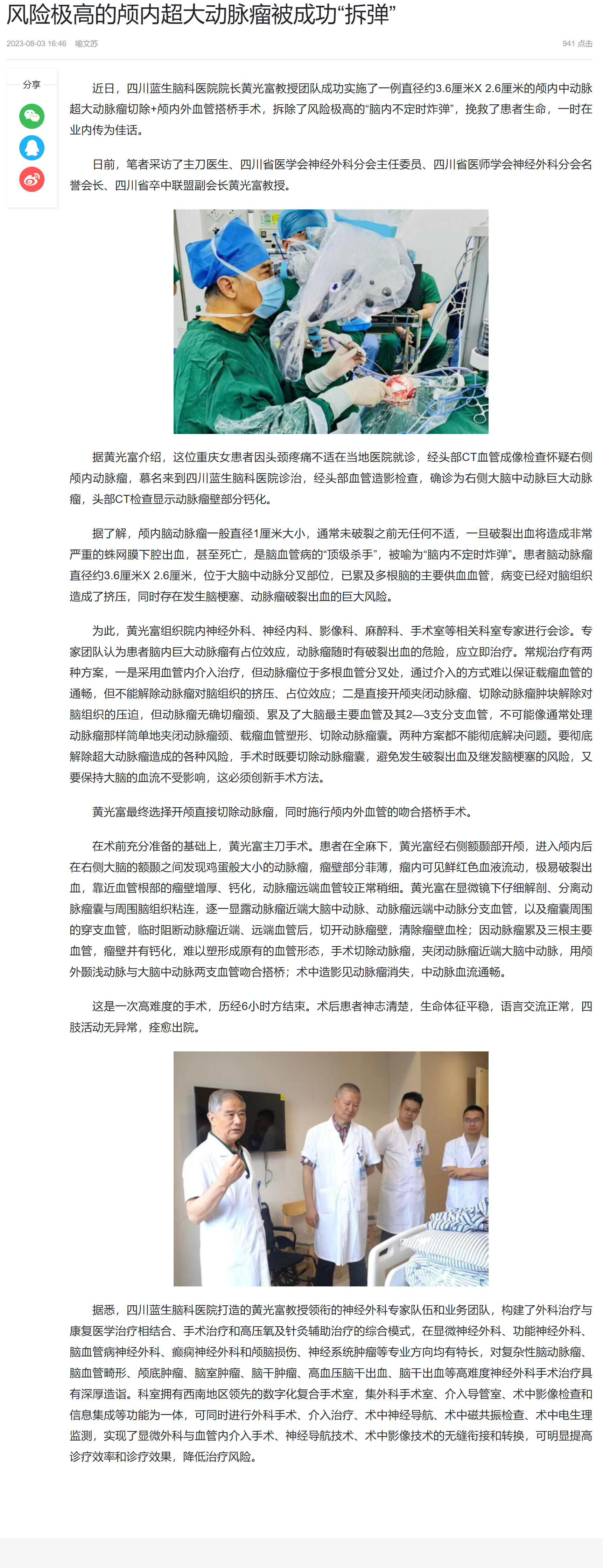 近日,四川藍生腦科醫院院長黃光富教授團隊成功實施了一例直徑約3.6厘米X 2.6厘米的顱內中動脈超大動脈瘤切除+顱內外血管搭橋手術,拆除了風險極高的“腦內不定時炸彈”,挽救了患者生命,一時在業內傳為佳話。