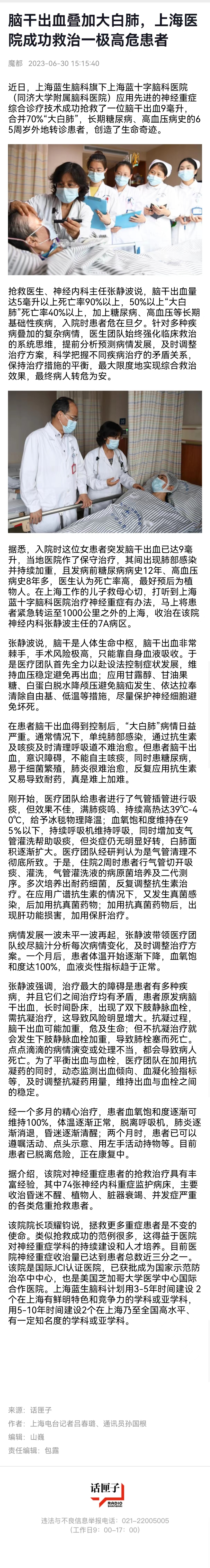 近日,上海藍(lán)生腦科旗下上海藍(lán)十字腦科醫(yī)院(同濟(jì)大學(xué)附屬腦科醫(yī)院)應(yīng)用先進(jìn)的神經(jīng)重癥綜合診療技術(shù)成功搶救了一位腦干出血9毫升,合并70%“大白肺”,長期糖尿病、高血壓病史的65周歲外地轉(zhuǎn)診患者,創(chuàng)造了生命奇跡。