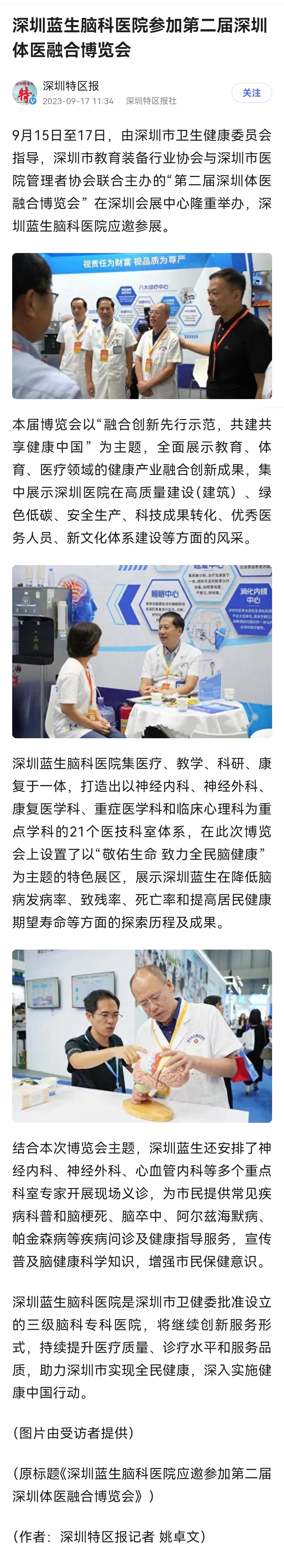 9月15日至17日,由深圳市衛(wèi)生健康委員會指導,深圳市教育裝備行業(yè)協(xié)會與深圳市醫(yī)院管理者協(xié)會聯(lián)合主辦的“第二屆深圳體醫(yī)融合博覽會”在深圳會展中心隆重舉辦,深圳藍生腦科醫(yī)院應邀參展。