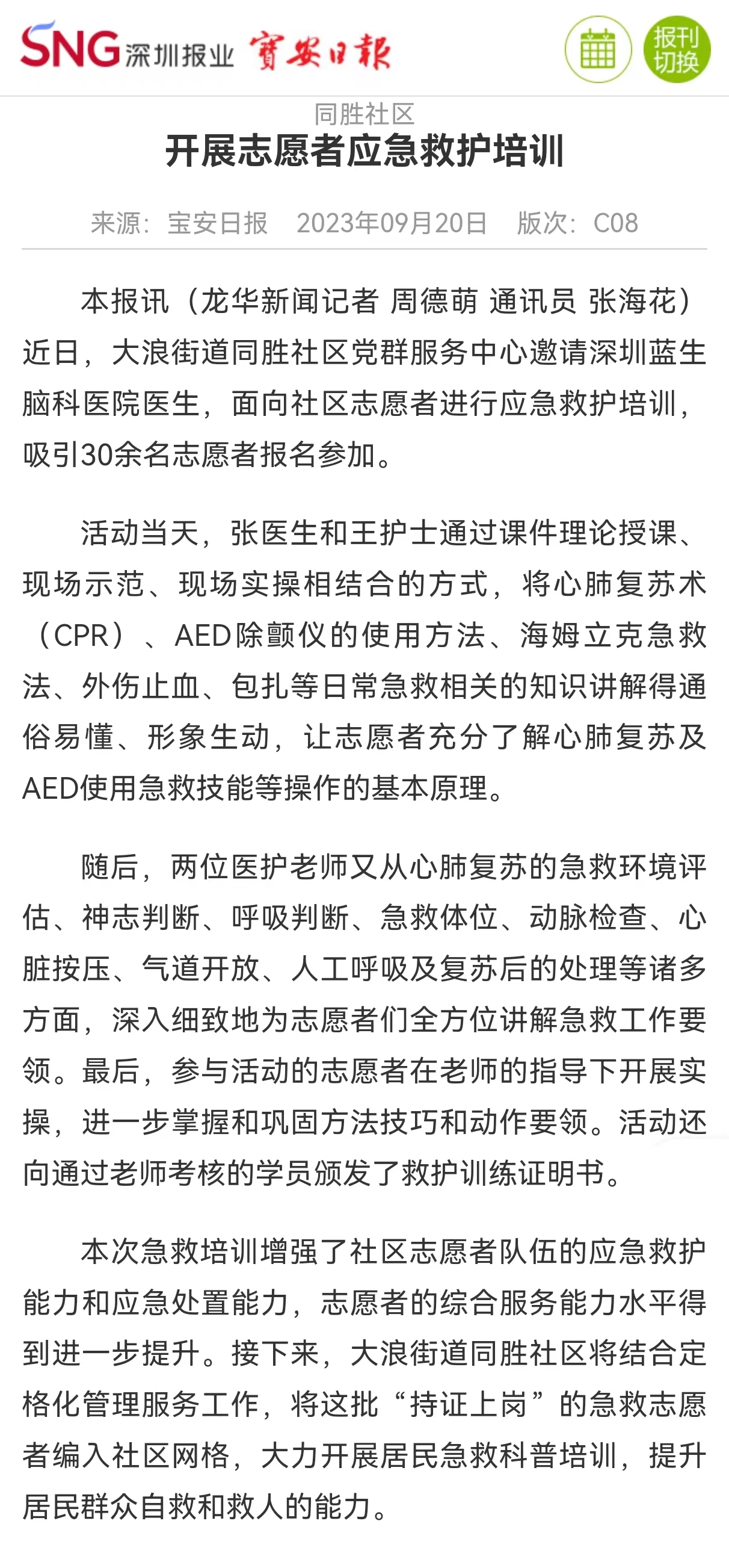 寶安日報:深圳藍生腦科醫院走進社區開展志愿者應急救護培訓