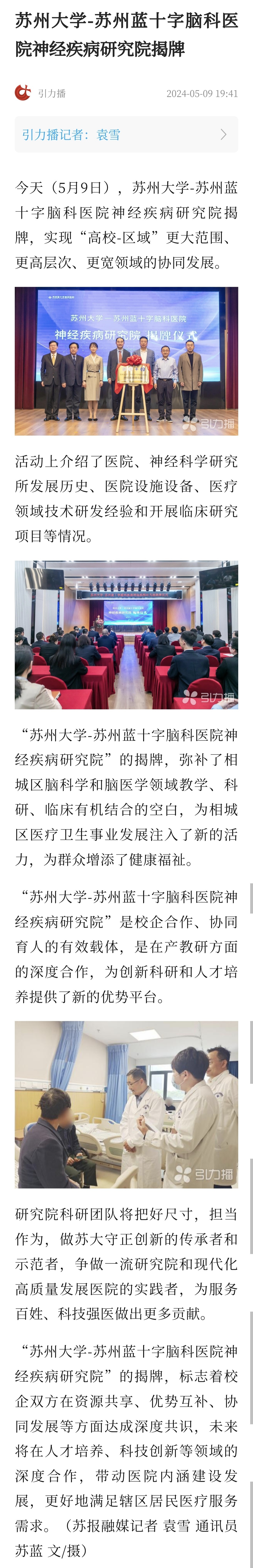 引力播:蘇州大學-蘇州藍十字腦科醫院神經疾病研究院揭牌