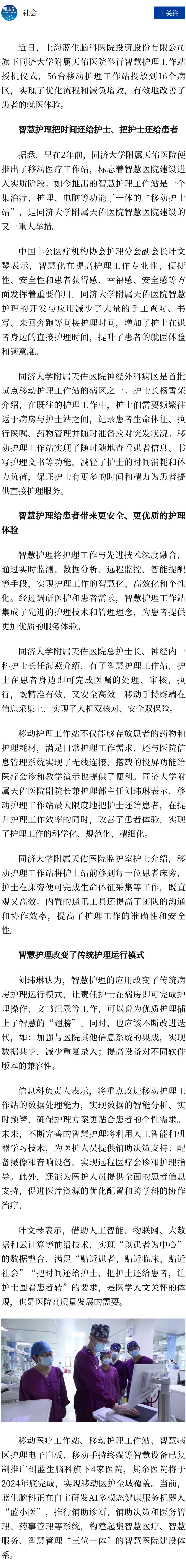 近日,上海藍生腦科醫院投資股份有限公司旗下同濟大學附屬天佑醫院舉行智慧護理工作站授機儀式,56臺移動護理工作站投放到16個病區,實現了優化流程和減負增效,有效地改善了患者的就醫體驗。