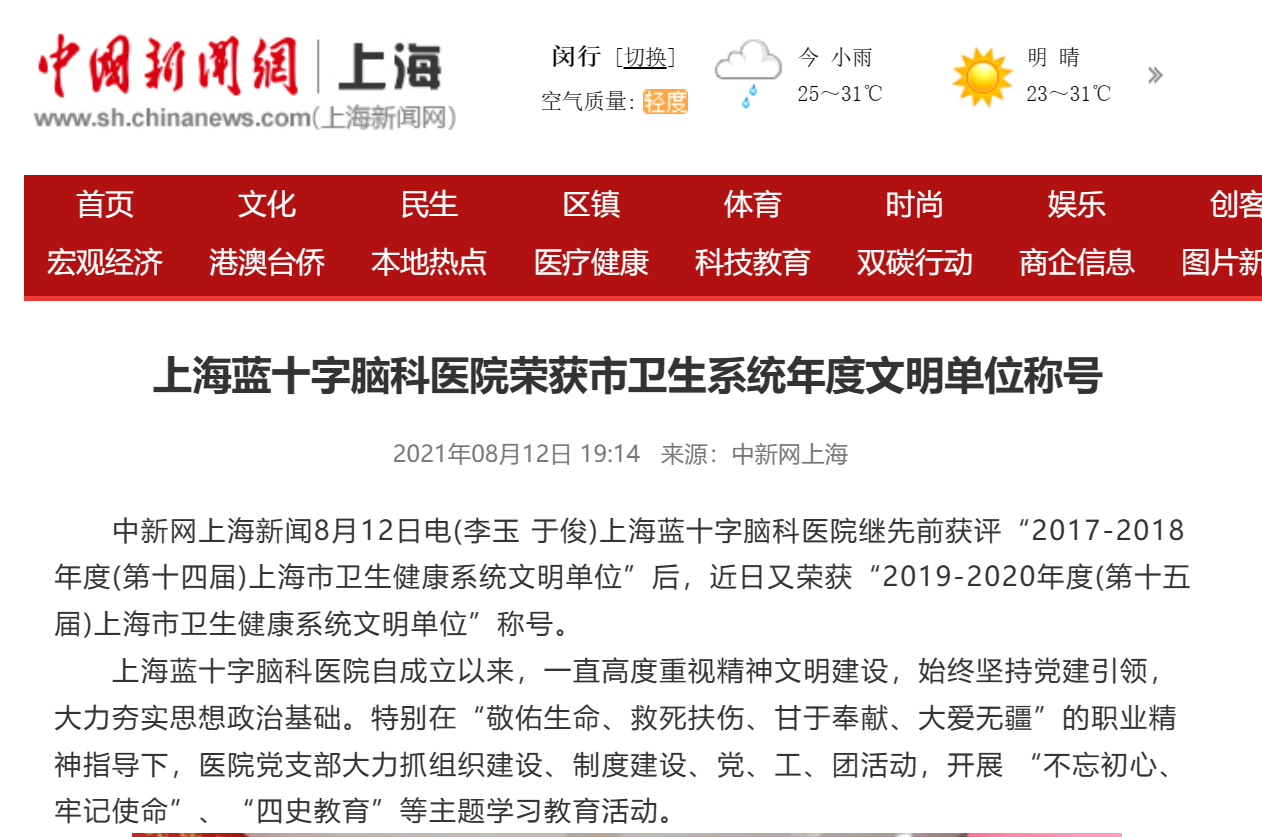中新網上海:上海藍十字腦科醫(yī)院榮獲市衛(wèi)生系統(tǒng)年度文明單位稱號