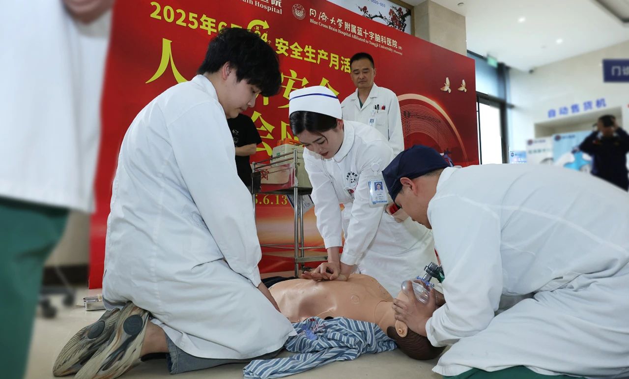 醫療急救:疏散過程中模擬有患者突發昏厥。醫院CPR急救小組迅速就位,實施現場緊急心肺復蘇,成功復蘇“患者”。