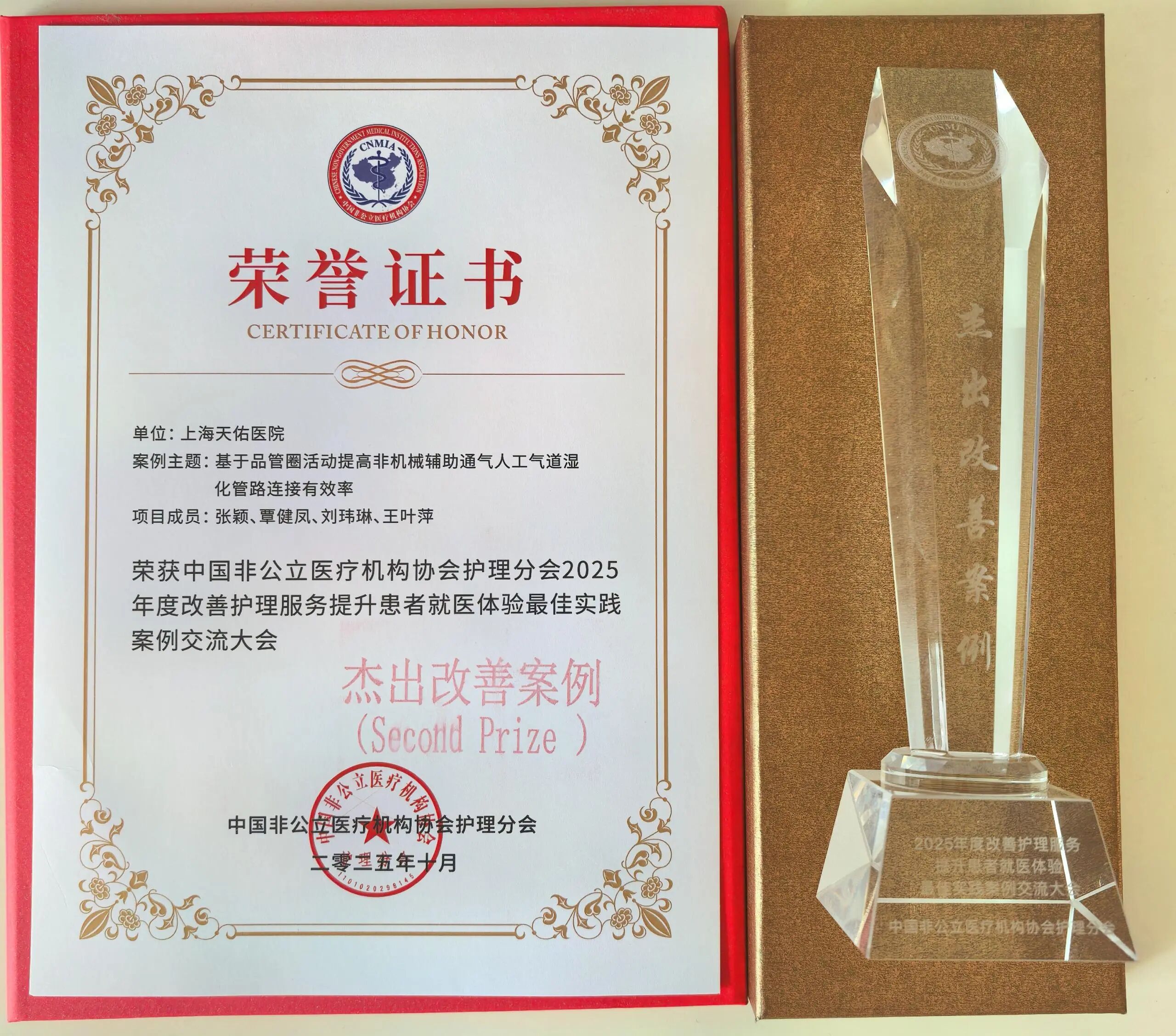 上海天佑醫院選送的張穎總護士長團隊(張穎、覃健鳳、劉瑋琳、王葉萍)項目《基于品管圈活動提高非機械輔助通氣人工氣道濕化管路連接有效率》案例成功晉級現場發表環節,并榮獲“杰出改善案例”(二等獎)。任海燕總護士長的《神經內科“智護、心護、優護”服務模式創新與實踐》項目獲壁報展示。