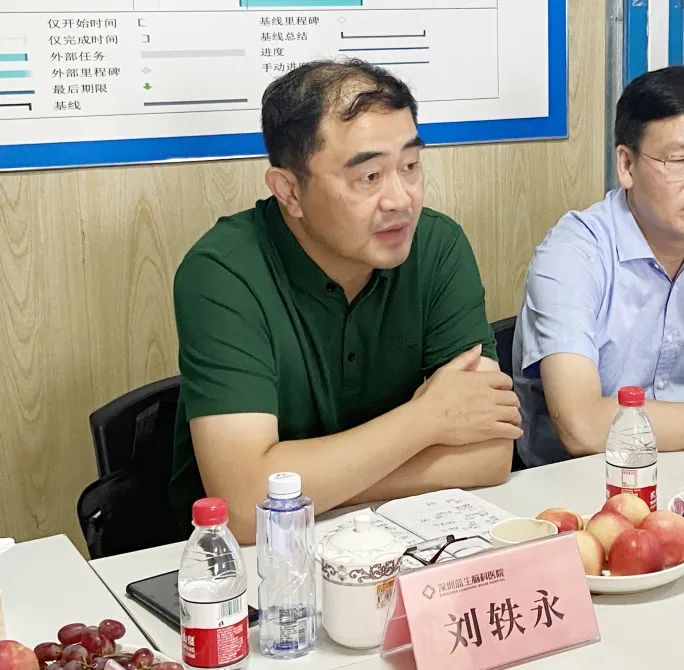 7月28日—29日,公司卓立強董事長率劉軼永總經理、陳樹林書記、霍華祎副總裁等一行赴深圳藍生腦科醫院,調研指導工程建設、團隊搭建、人才招聘、市場建設等工作,明確近期重點任務,指明未來發展方向。醫院劉長續執行院長、程子昊總經理等班子成員陪同并匯報工作。