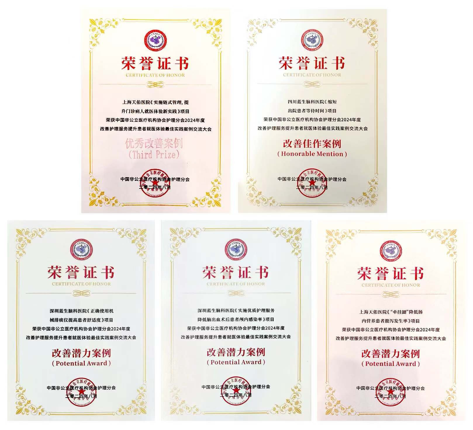 8月30-31日,中國非公立醫療機構協會護理分會2024年學術年會暨改善護理服務提升患者就醫體驗最佳實踐案例交流大會在南京召開。公司旗下上海天佑醫院、四川藍生腦科醫院、深圳藍生腦科醫院選送的5項案例成功晉級現場發表環節,1項獲優秀改善案例,1項獲改善佳作案例,3項獲改善潛力案例。