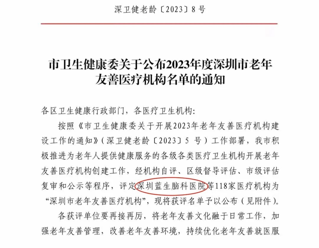 深圳藍生腦科醫院獲評老年友善醫療機構