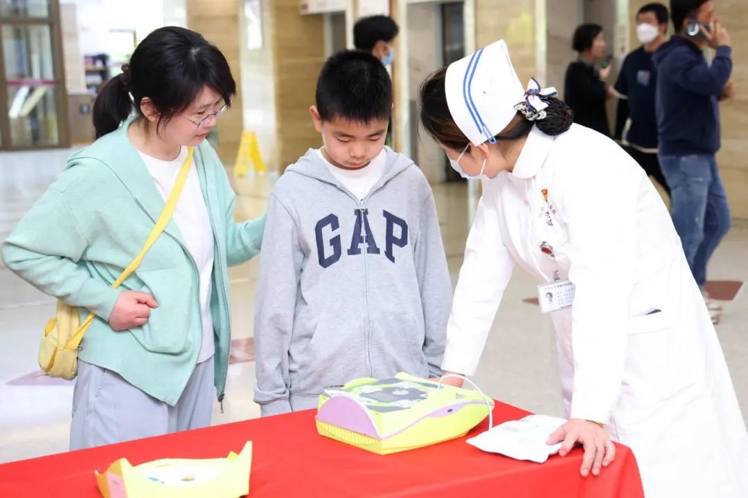 "每個動作都要規范到位,這關系到孩子的生命安全。"在急救技能實訓環節,天佑醫院的黨員醫護分組指導家長和孩子們練習海姆立克急救法、心肺復蘇和AED使用,幫助大家成為合格的"家庭急救員"。通過人體模型演示,家長和孩子們系統掌握了不同年齡段兒童的氣道梗阻急救要領:1歲以上兒童采用站立位腹部沖擊法(需注意力度適中,避免二次傷害),1歲以下嬰兒則需交替進行背部叩擊與胸部按壓(操作時需保持嬰兒身體穩定、頭低臀高)。同時,大家還在AED設備旁認真學習了具體使用步驟。