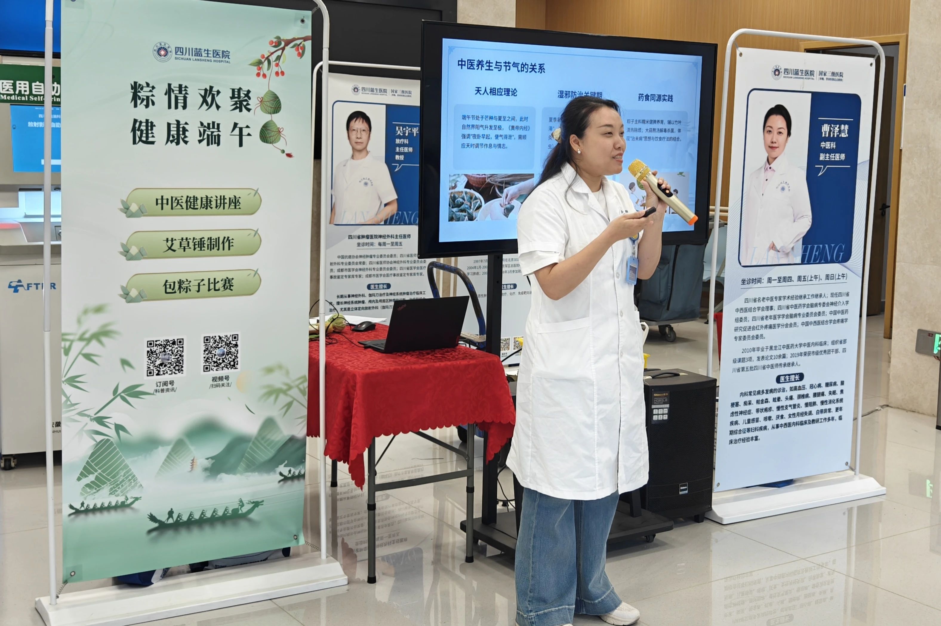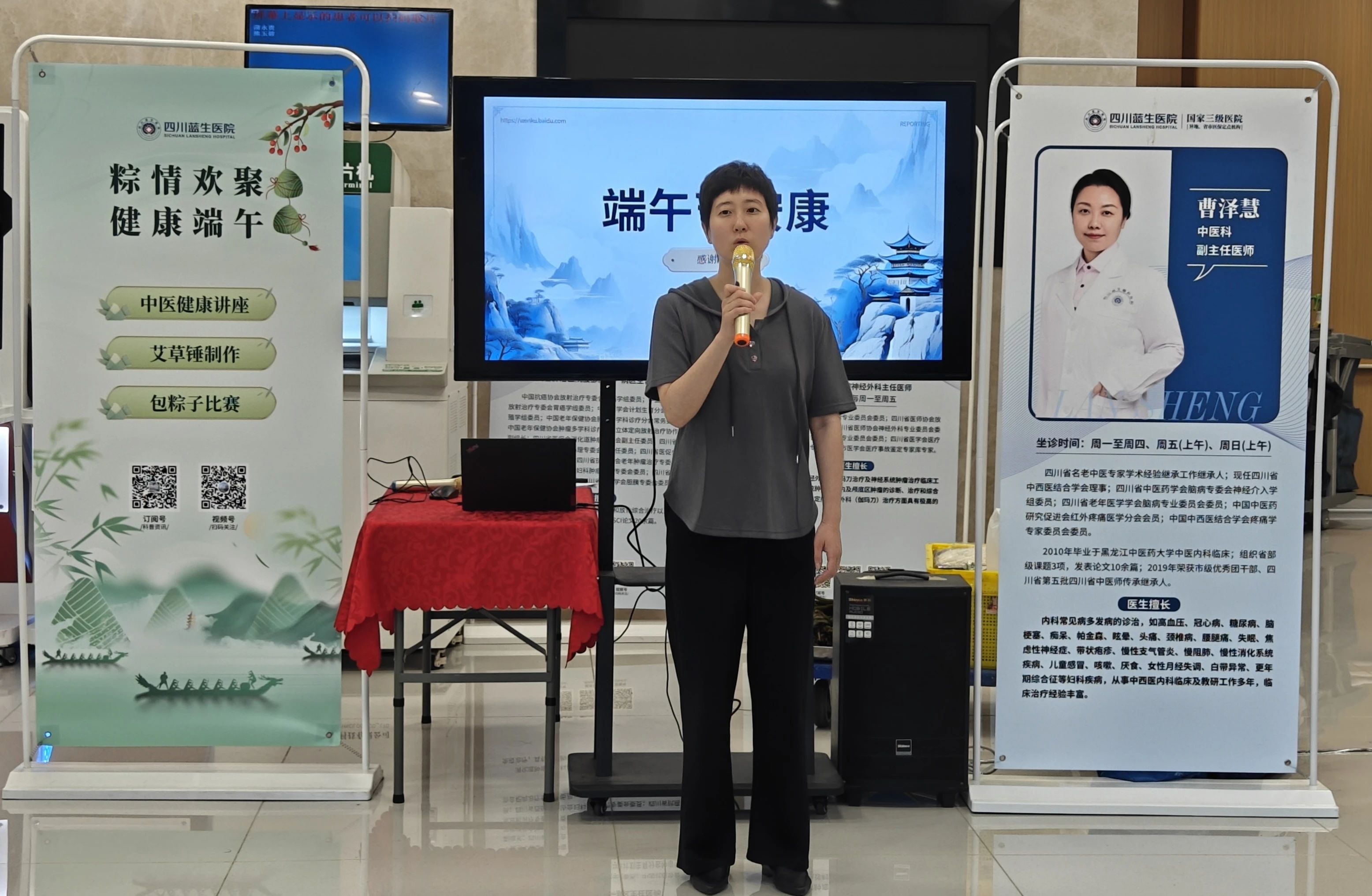 活動開場,中醫科曹澤慧副主任帶來一場精彩的中醫健康講座。她結合端午傳統習俗,深入講解夏季養生要點,涵蓋飲食調理、起居作息、運動鍛煉等方面。曹主任強調,端午時節氣溫高、濕度大,易引發身體不適,因此要注意飲食清淡,多吃蔬菜水果,避免食用過多油膩、辛辣食物;同時保證充足的睡眠,適當進行運動,以增強體質,預防疾病。講解生動有趣,贏得現場觀眾的陣陣掌聲。