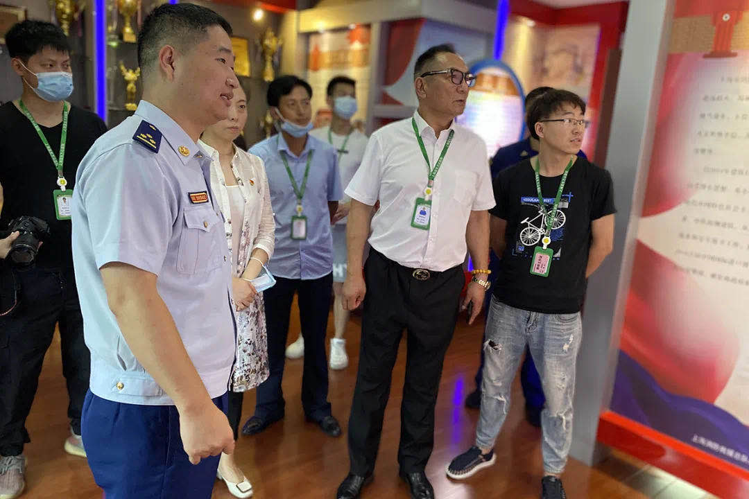 在徐匯消防支隊參謀長江偉的帶領下,一行領導參觀了徐家匯消防中隊消防車輛裝備器材及訓練區。徐家匯消防中隊指導員許宇峰、徐家匯消防救援站站長胡耀華詳細介紹日常防火滅火知識、逃生自救常識、器材裝備使用功效以及消防員滅火過程。