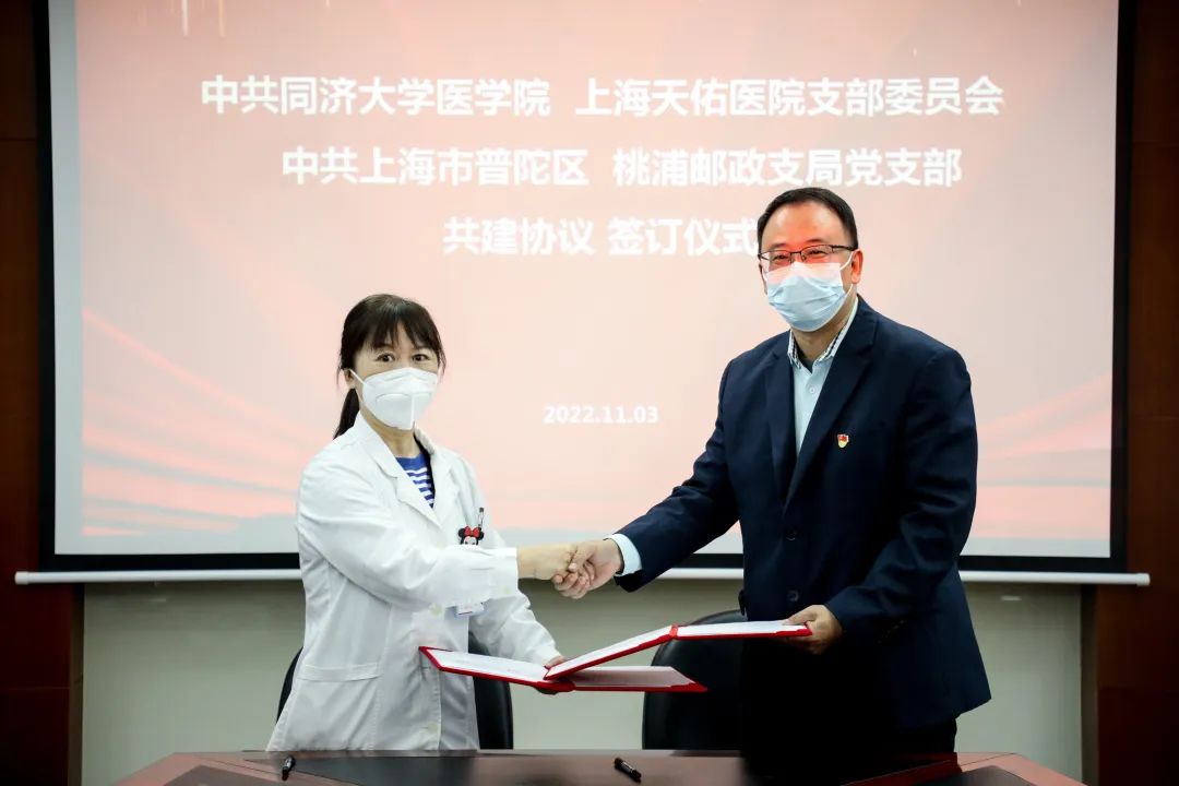 11月3日下午,上海天佑醫(yī)院黨支部與普陀區(qū)桃浦郵政支局黨支部開展共建簽約儀式。天佑醫(yī)院執(zhí)行院長王強、黨支部書記葉建蘭,桃浦郵政支局支局長、黨支部書記于進,副支局長陳亮及雙方黨員代表參加了共建簽約活動。