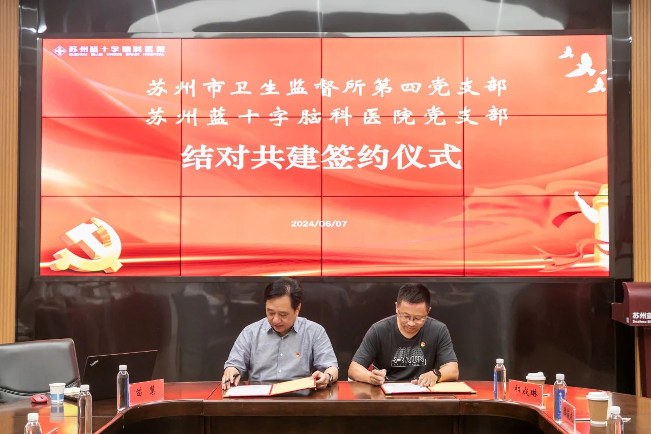 會上,蘇州藍十字腦科醫院黨支部書記徐必生與蘇州市衛生監督所第四黨支部書記何愷在簽約席共同簽署了《黨建共建協議書》。