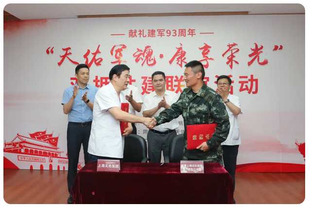 在第93個建軍節來臨之際,桃浦鎮雙擁共建聯誼活動于7月30日下午在同濟大學附屬天佑醫院(籌)舉行。本次聯誼活動由桃浦鎮人武部、桃浦鎮雙擁辦和上海天佑醫院聯合舉辦。桃浦鎮黨委委員、人武部部長陳火春,天佑醫院院長蔡劍飛、總經理卓立峰及院領導班子成員出席。桃浦鎮社發辦、武警上海總隊執勤第三支隊二大隊、普陀區消防桃浦特勤中隊、同濟大學老科協、老年大學、桃浦郵政局、地鐵運營公司等單位領導、現役或退役軍人代表50余人參加。