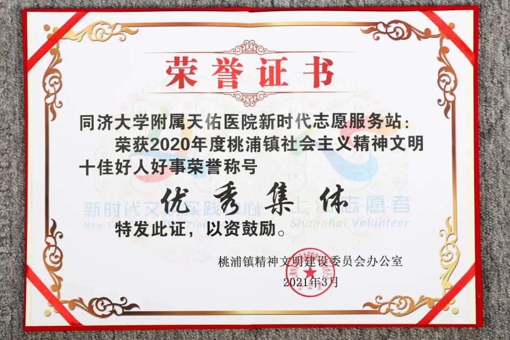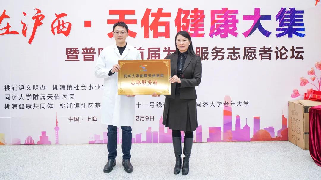 2019年12月2日,醫(yī)院被桃浦鎮(zhèn)文明辦正式授予“同濟大學(xué)附屬天佑醫(yī)院志愿服務(wù)站”,截止2020年底,天佑醫(yī)院志愿服務(wù)站共計吸納黨員志愿者22名,醫(yī)護志愿者50名。2020年開始,天佑醫(yī)院又承擔(dān)了健康桃浦1+1、健康桃浦“醫(yī)籃子”等公益項目,為區(qū)域內(nèi)百姓提供醫(yī)療服務(wù),樹立了良好口碑。