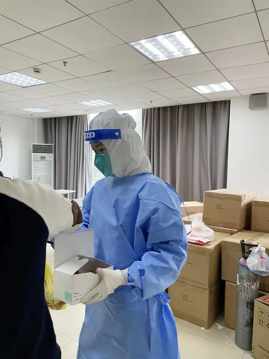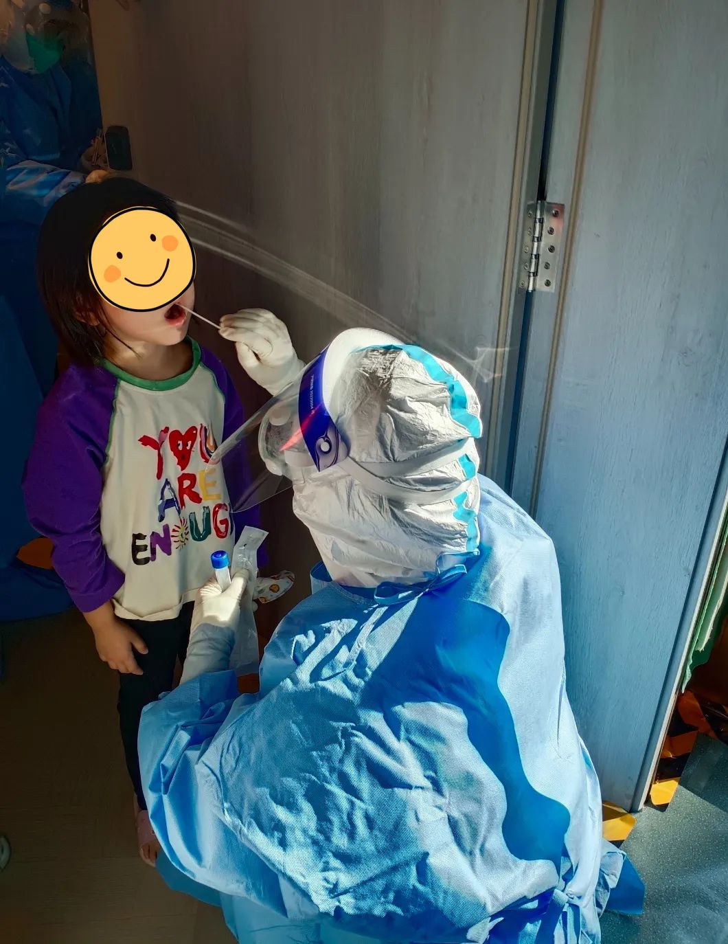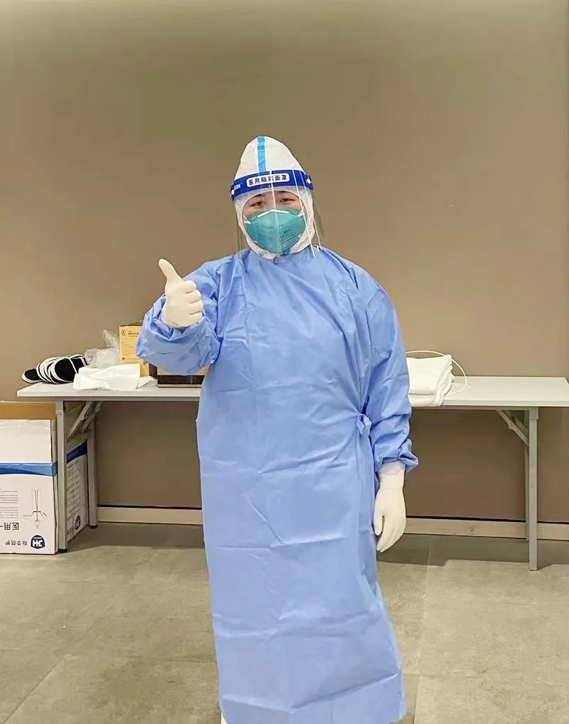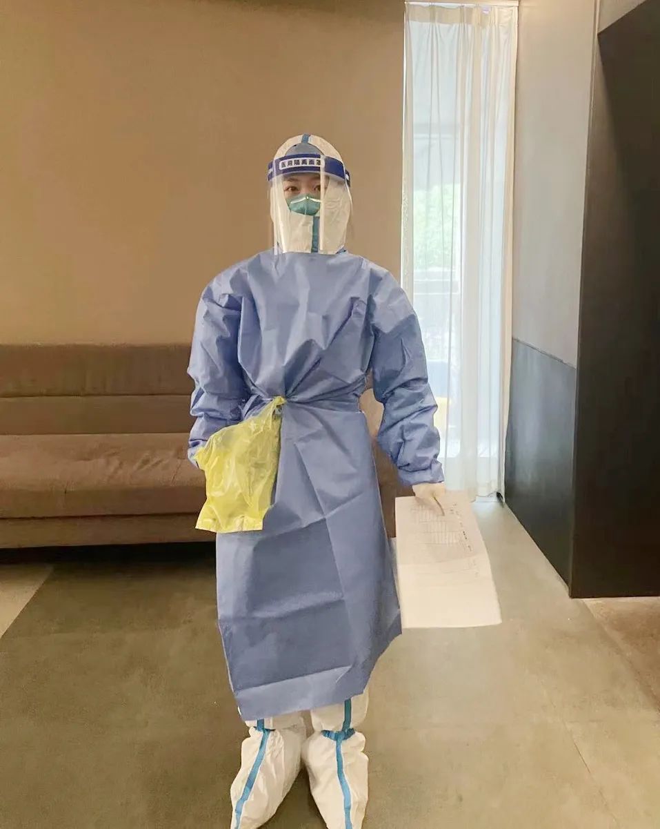 在長風商務區支援防疫的我,主要負責給隔離人員采集核酸。穿著厚厚的防護服挨個樓層敲門采集核酸,測量體溫,遇到不會操作核酸碼的老人需要耐心指導,有人困惑時需要耐心解答,有人焦慮時需要暖心安撫,我所做的這一切就是為了幫助他們順利度過隔離期。盡管每天的工作消耗著大量的體力,脫下防護服時衣服都被汗水浸透,面龐早已被面罩壓出勒痕,但是每當聽到小朋友說一句“謝謝大白阿姨”,每當聽到叔叔阿姨問一句“午飯吃了沒”,陣陣暖流就涌入到我的心間,感覺所有的辛勤付出都值得。