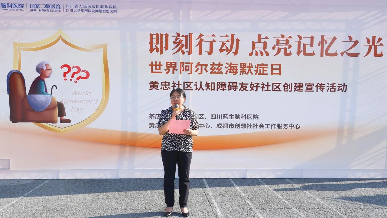 9月21日上午9時,活動正式拉開帷幕。黃忠社區黨委書記李秀枝發表開場致辭,她深情地表達了社區對居民健康的深切關懷,并對此次活動的舉辦給予了高度評價。隨后,四川藍生腦科醫院神經內科二病區主任程俊上臺致辭,他強調了早期識別與干預阿爾茨海默癥的重要性,并承諾醫院將持續為社區居民提供高質量的醫療服務與健康教育。