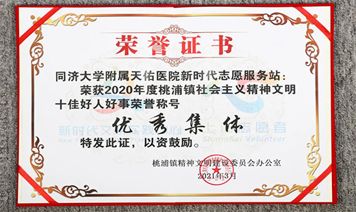上海天佑醫院志愿服務站獲桃浦鎮“十佳好人好事”優秀集體稱號